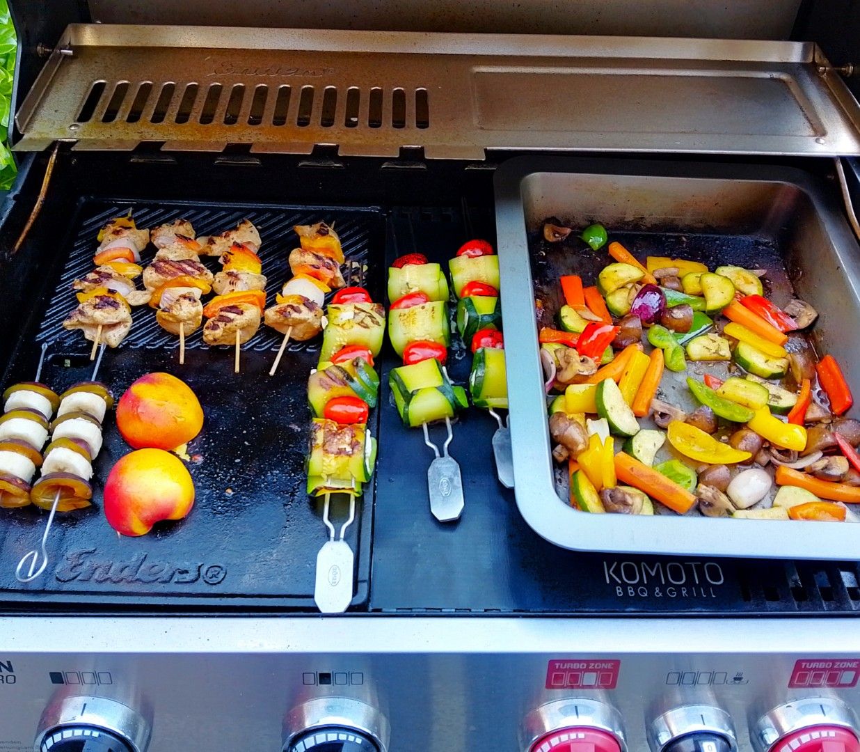 auf dem Grill wurden verschiedene Gerichte zubereitet: Gemüsepfanne, Kingklip-Filet (Fisch), Hähnchenspießchen, Zucchini-Spieße mit Feta, Nektarinnen, Pflaumen, Bananen, Birnen, Pfirsich mit Mozzarella.