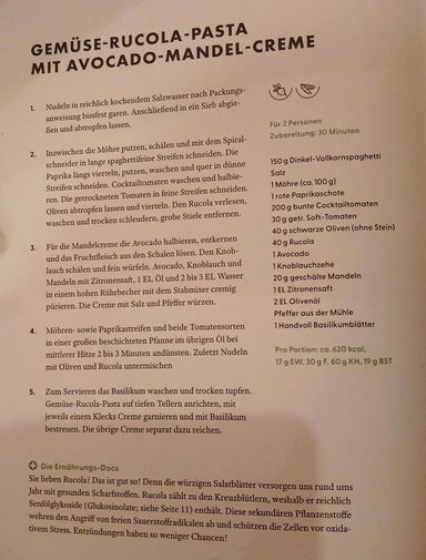 Gemüse-Rucola-Pasta mit Avocado-Creme auf Nudeln