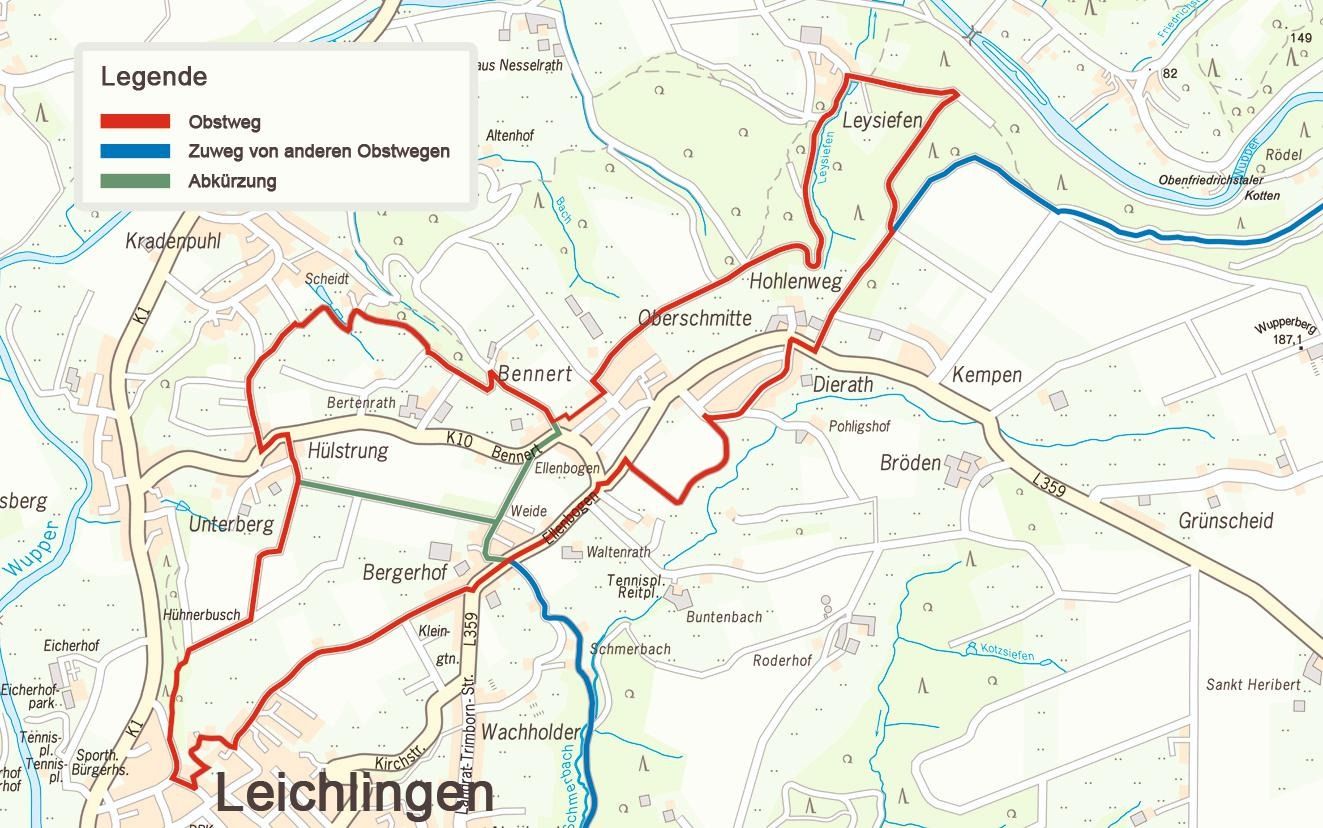 Strecke: Bei dem „Obstweg Leichlingen” handelt es sich um einen ausgeschilderten Wanderweg durch Hülstrung, Leysiefen und Bergerhof, der an vielen Obstwiesen entlangführt. Interessierte können dabei Spannendes und Wissenswertes über Streuobstwiesen und ihre Tier- und Pflanzenwelt lernen.